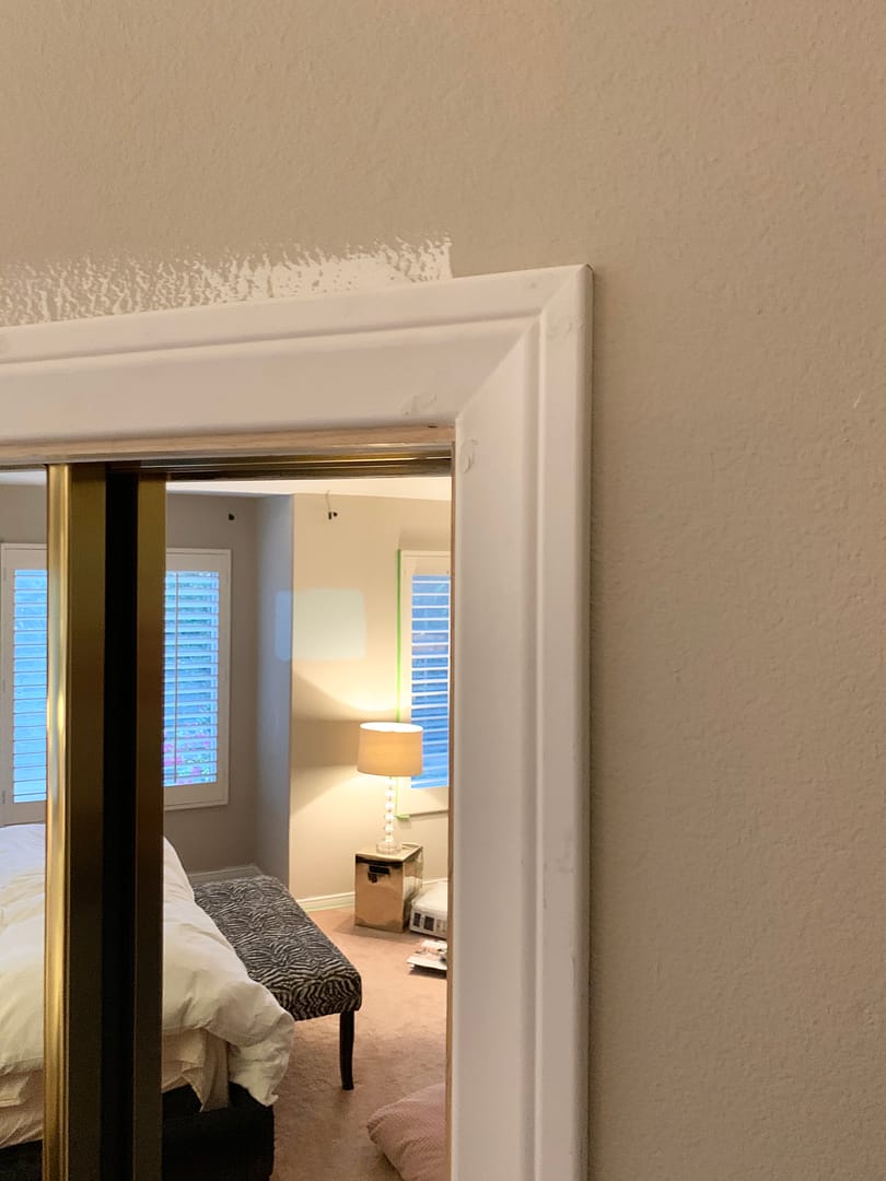 Another holdover from the eighties are the brass closet doors. We’ve already established that this master bedroom has a fairly – odd – floor plan but we’re all about embracing it and that includes the doors. I wasn’t ready to jump into replacement and since I am accenting with gold, I opted to add molding around the full frame.
